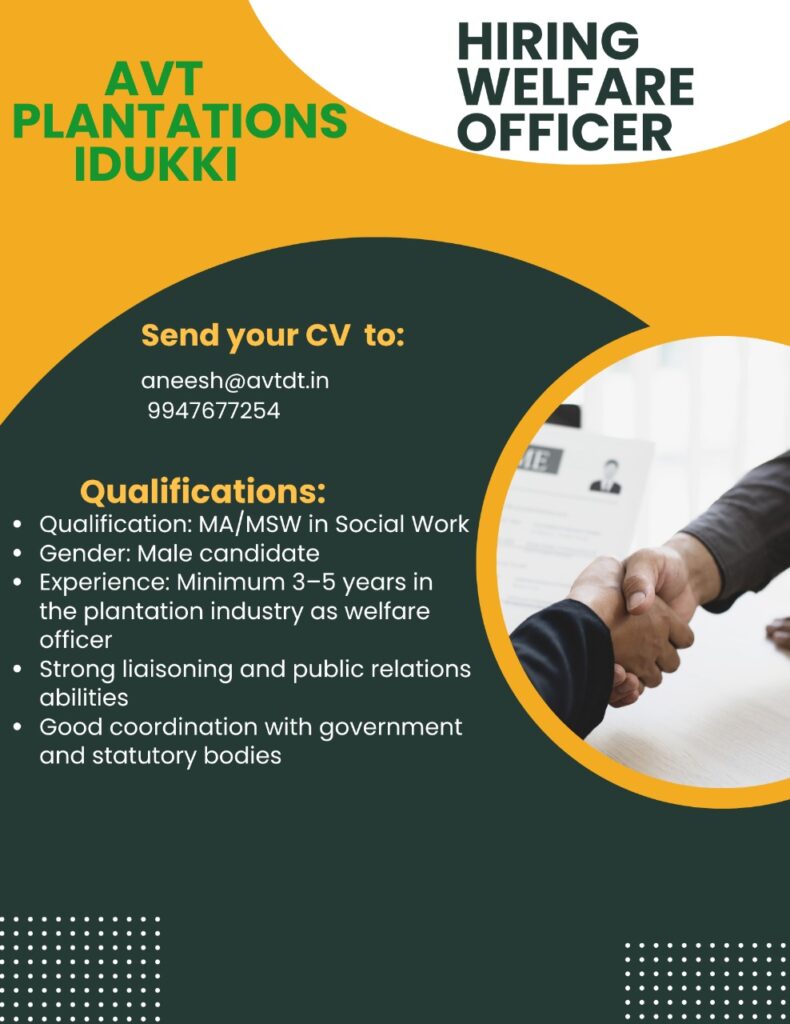 - Experience: Minimum 3–5 years in the plantation industry as a Welfare Officer