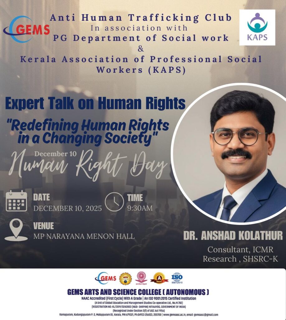 Kerala Association of Professional Social Workers (KAPS), in association with the PG Department of Social Work, GEMS Arts and Science College, organized a highly impactful Expert Talk on Human Rights on December 10, 2025, in observance of Human Rights Day. The event took place at the MP Narayana Menon Hall.