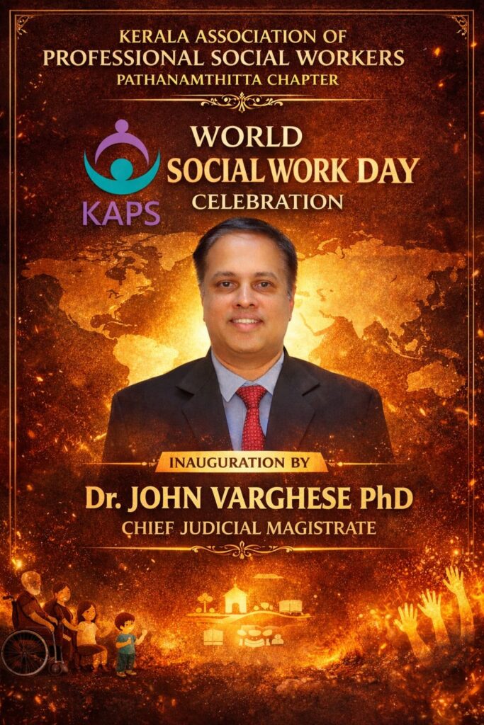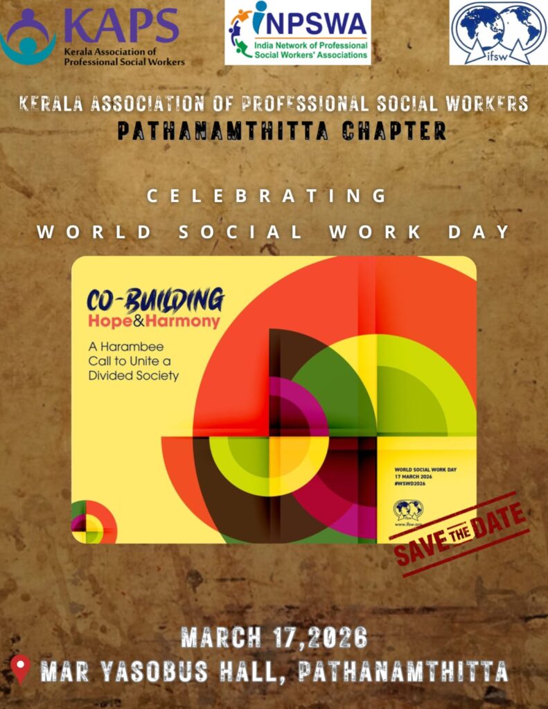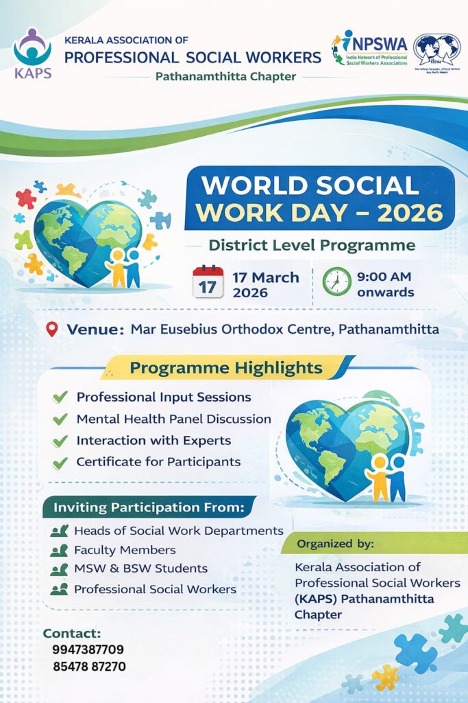 Pathanamthitta : The Kerala Association of Professional Social Workers (KAPS), Pathanamthitta District Chapter cordially invites you to participate in the World Social Work Day – 2026 District Level Programme, to be held on 17 March 2026 from 9:00 AM onwards at Mar Eusebius Orthodox Centre.