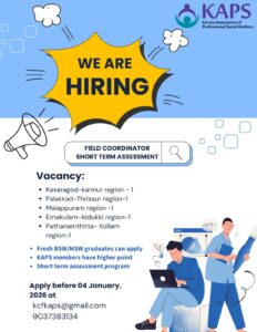 The Kerala Association of Professional Social Workers (KAPS) invites applications for the post of Field Coordinator for a Short Term Assessment Program across selected regions of Kerala.